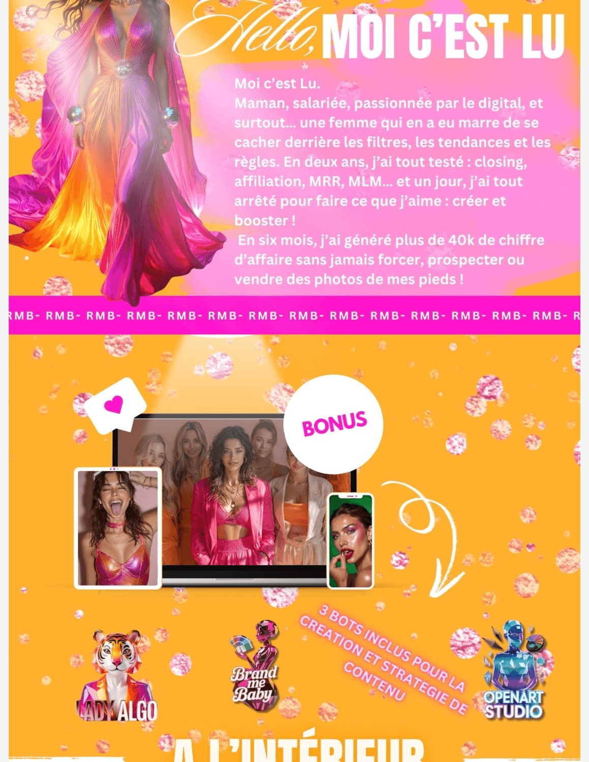 RMB est une formation, pour générer les images, vidéos tu seras amenée à utiliser des plateformes payantes. Différentes Méthodes et plateformes sont enseignées